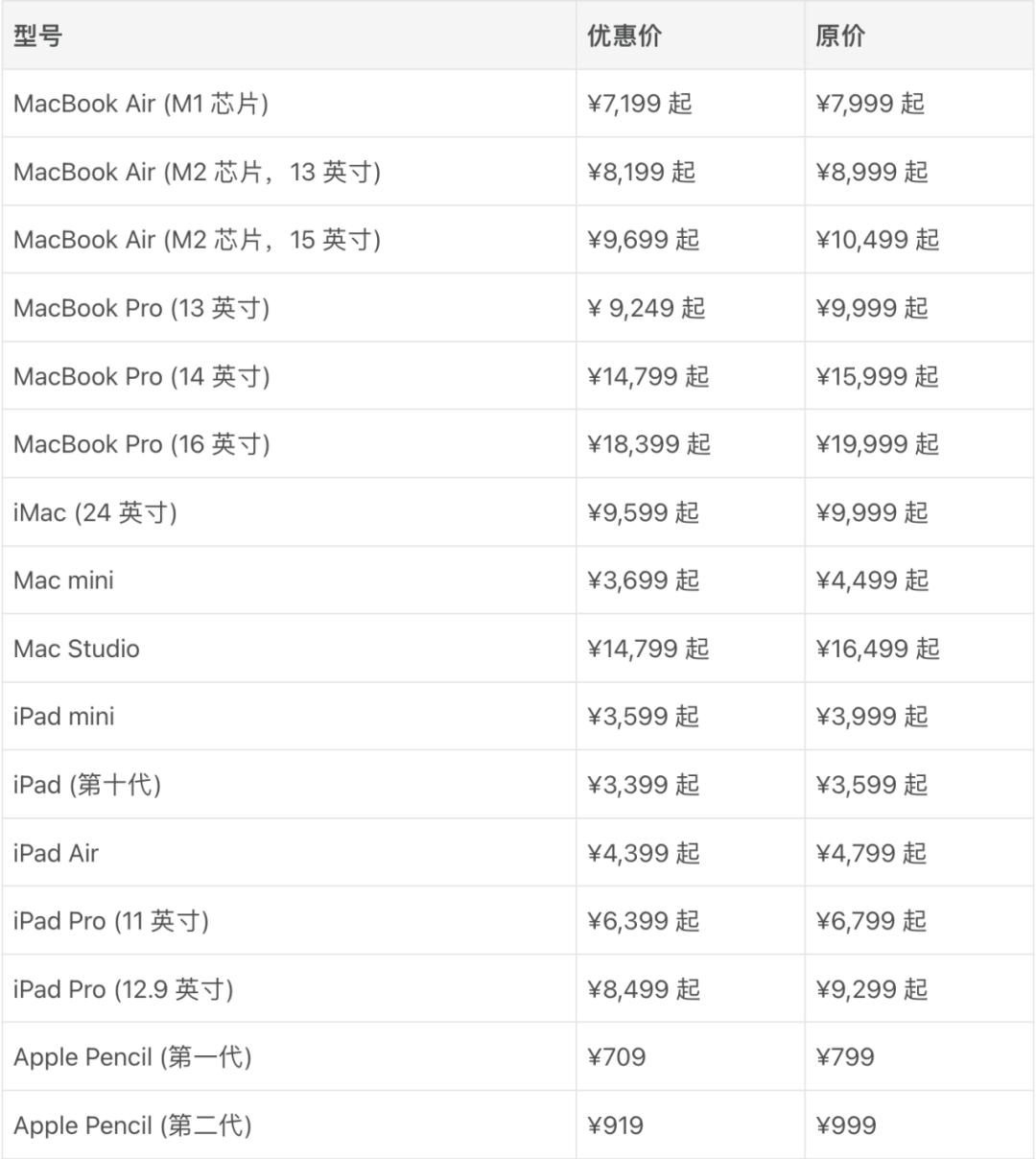 除了免费加购 AirPods 和 Apple Pencil,Apple Store 教育商店提供的教育折扣依然有效,购买 Mac、iPad 官网在售机型以及 Apple Pencil、iPad 智能键盘等配件都有不同程度的优惠: