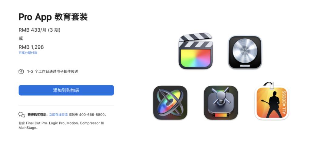 除了硬件,如果你有视频和音频剪辑的专业需求,可以考虑购买 Apple 专门为教育而设的Pro App 教育套装 ,以 1,298 元的价格打包购买 Final Cut Pro X、Logic Pro X、Motion 5、Compressor 4 和 MainStage 3 五款专业级 App。