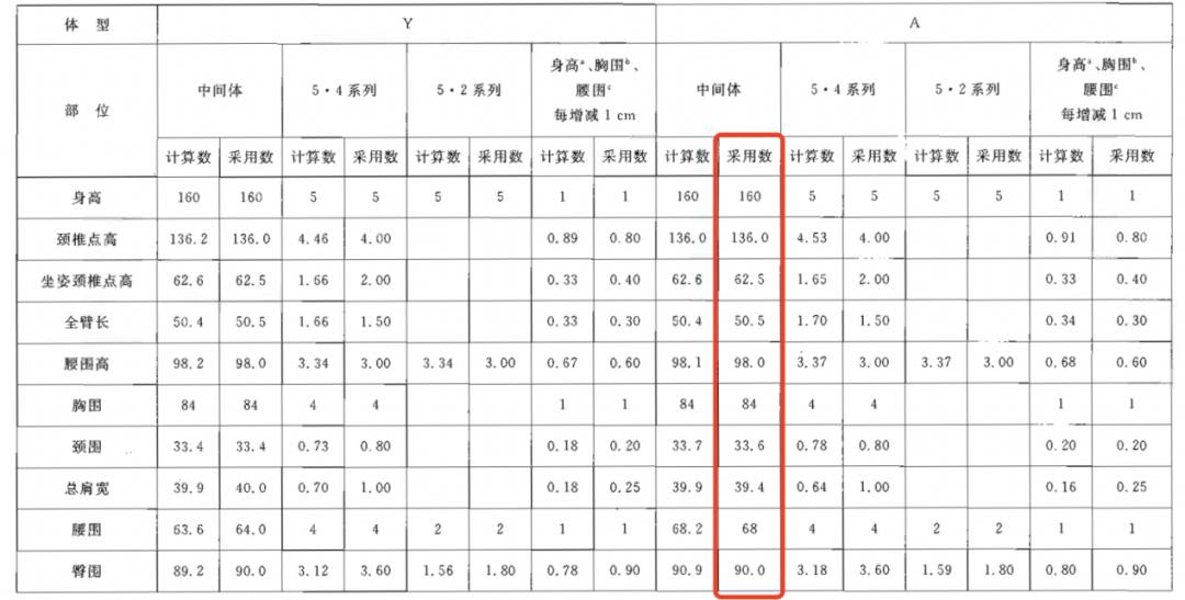 值得一提的是,这版国标中提到了服装号型应当以中间体为中心,向两边依次递增或递减,在国标中列举的A型身材中间体数据为身高160、胸围84、腰围68,可以说是最常见的中国成年女性身材。