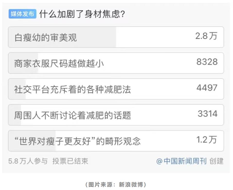 在中国新闻周刊发起的“什么加剧了身材焦虑”的投票中,近一半的人认为“身材焦虑”来自于“白瘦幼”的审美观,其次是“世界对瘦子更友好”的畸形观念,衣服尺码变小和减肥话题也在不断加剧身材焦虑。审美本应该是多元的,环肥燕瘦各有所长,但越来越多女性开始追求“A4腰”、“直角肩”、“漫画腿”等标签化的以瘦为美的好身材。