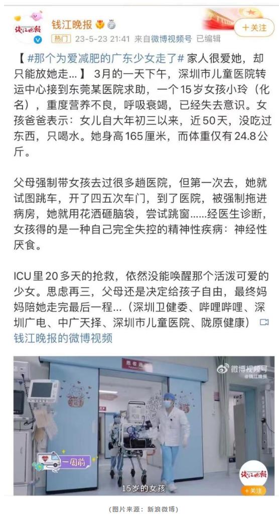 事实上,在东亚社会中,“body shame”始终伴随着年轻女性,“白瘦幼”的审美本质上是一种父权制社会审美规训的结果。在“以瘦为美”的审美流行文化的影响下,社会将女性身材胖与瘦与好、坏挂钩,在这种审美文化的范畴里,女性的瘦象征着自信、自律和成功,而肥胖身材的女性则被贴上懒惰、松懈、失败的标签。而令人担忧的是,不少年轻人在这种畸形审美的影响下,对瘦的追求达到了病态的程度。前段时间,一个15岁少女“为爱减肥”最终不幸离世的故事引起了广泛关注,这个可怜的女孩儿因长期的节食减肥患上了神经性厌食,最终重度营养不良去世,而在减肥之前,身高165的她最重的体重也只是54公斤,是非常健康的体重,远远算不上肥胖。