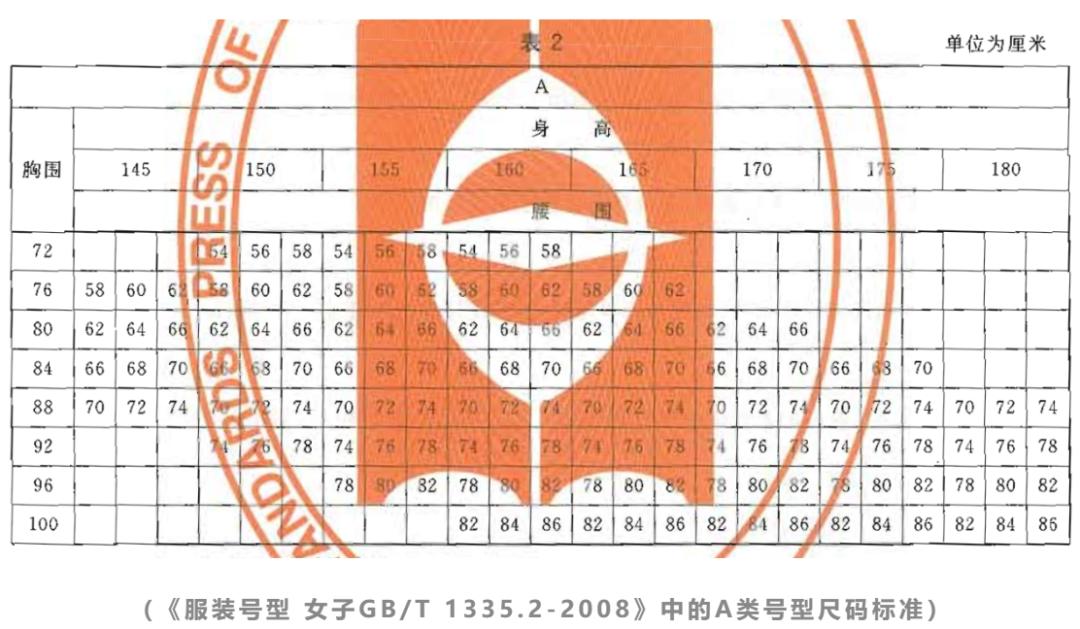 早在1997年,中国国家标准化管理委员会就发布了女装的尺码国标,在2008年又进行了一版更新,即《服装号型 女子GB/T 1335.2-2008》。标准中将成年女子体型根据胸围和腰围的差划分为四类,分别代号Y、A、B、C,其中我国女子最常见的身材为A型。几年前常见的女装尺码标注方式就来源于这版国标,如上装160/80A,代表身高160、胸围80的A型身材,下装160/64A,代表身高160、腰围64的A型身材。国标中提到,身高以5cm分档、胸围以4cm分档、腰围以4cm/2cm分档,如果商家参照该国标执行,基本上可以涵盖绝大多数女性的身材。