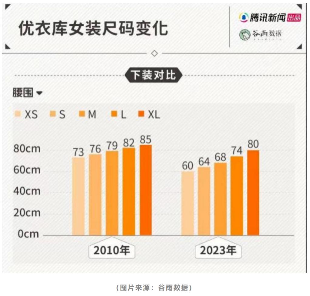 如果只是部分风格的女装变得短紧小,消费者还可以通过选择其他风格或更大的尺码来挑选适合自己的衣物,但事实上,几乎所有女装尺寸都在悄悄缩水。根据谷雨数据统计,2023年的优衣库女装相比2010年几乎小了两个尺码,其中下装的腰围变化最为明显。2010年优衣库的XS号下装腰围73,而在2023年,XS号下装腰围是60,腰围73只能L号了。明明身材没有变化,衣服尺码却大了两码,那原本该穿L号的消费者又该如何选择呢?