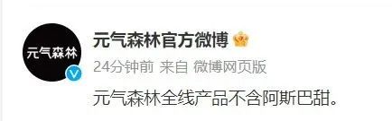 元气森林表示,全线产品不含阿斯巴甜。元气森林以赤藓糖醇为主的代糖配方,解决阿斯巴甜等甜味剂的口感问题。