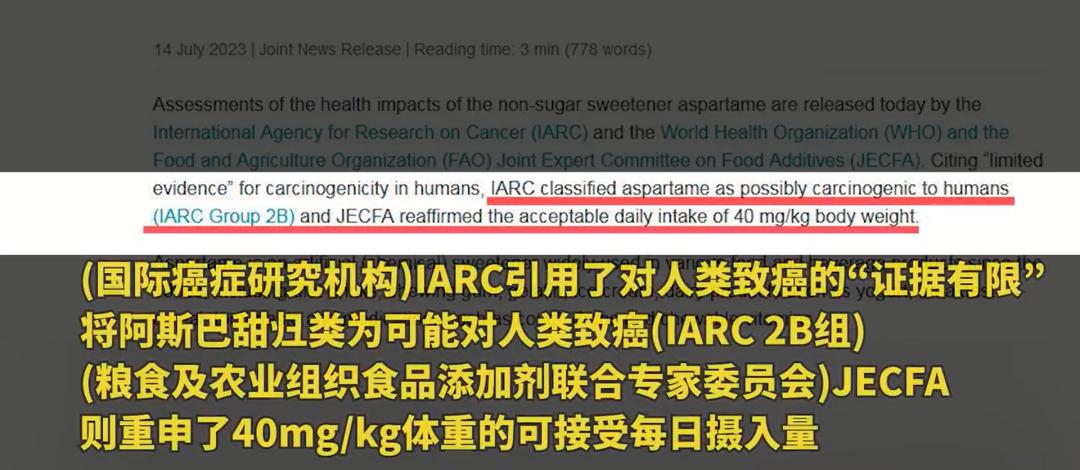 7月14日,国际癌症研究机构(IARC)、世界卫生组织(WHO)和粮食及农业组织食品添加剂联合专家委员会(JECFA),发布了阿斯巴甜对健康影响的评估结果,它被归类为“2B类致癌物”(可能的人类致癌物)。