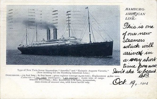 1904年,乘坐汉堡-美洲航运公司游轮的乘客在明信片里描述了海上之旅。