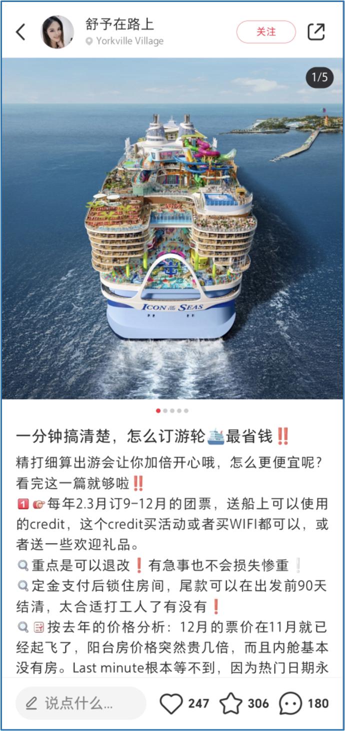 独自出行预订 游轮产品 时,会出现单人入住双人房需补差价的情况。好在当代年轻人,大多自带玩转社交媒体的“社牛”属性,预定好行程后发条笔记,找个搭子,省钱又有伴。