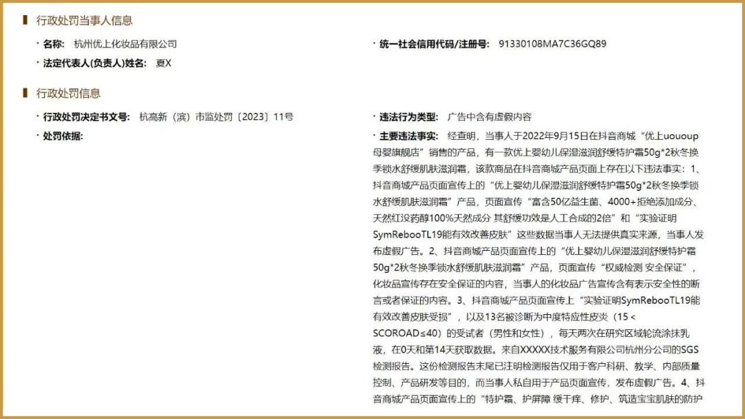 在今年3月份,小杨哥直播带货的“优上婴幼儿保湿滋润舒缓特护霜”,因虚假宣传被杭州市高新区市监局处罚5.64万。