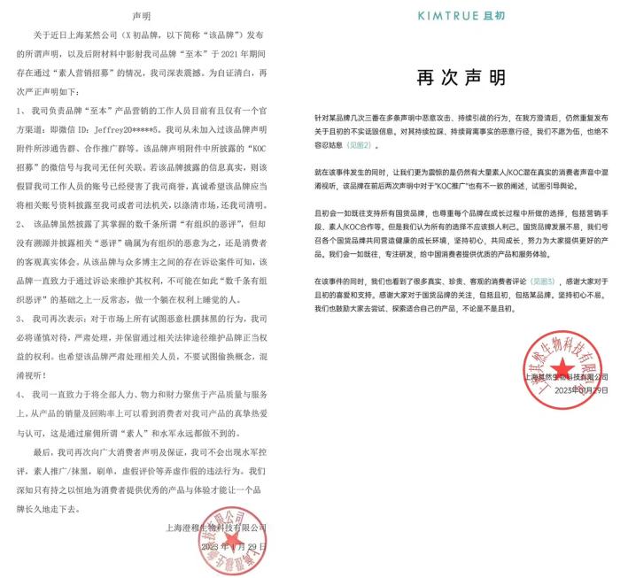 在今年年初,至本及且初这两个知名度较高的国货品牌,就“公开”互指对方雇佣水军抹黑自家品牌。而双方争论的方向,则是在小红书平台出现的批量虚假抹黑品牌产品的素人笔记。