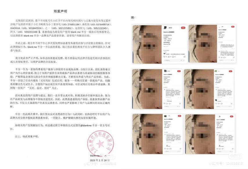 在2月底,国货彩妆品牌blank me半分一也在小红书平台发布官方声明称: