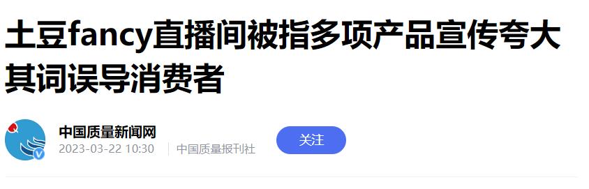 无独有偶,一位坐拥七百万粉丝的美妆博主“土豆fancy”,则涉嫌夸大宣传,多次违规误导消费者的行为,被中国质量新闻网点名报道。