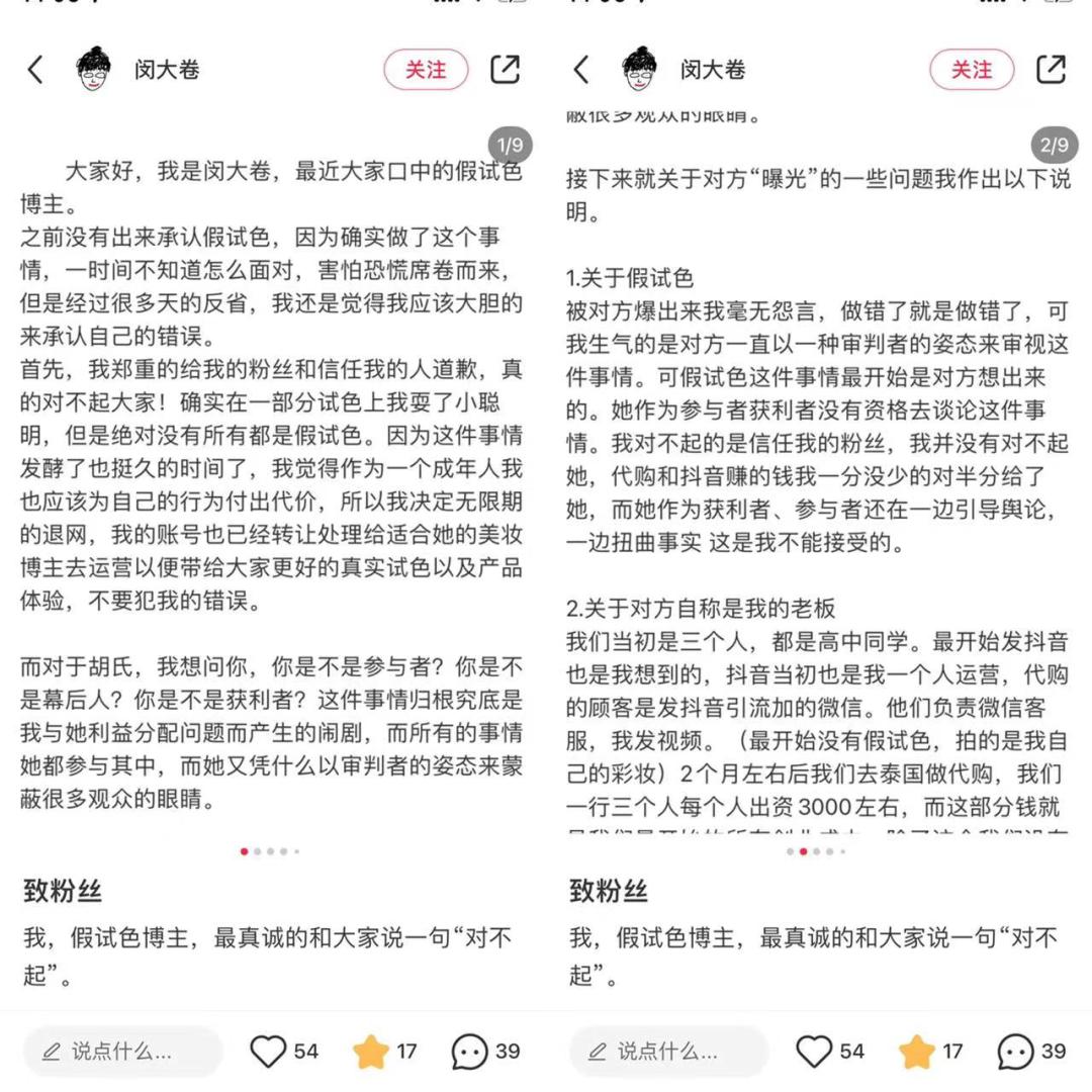 在3月初,一位小红书美妆博主闵大卷发布笔记公开道歉,自己因虚假试色向公众道歉,并将账号停更。