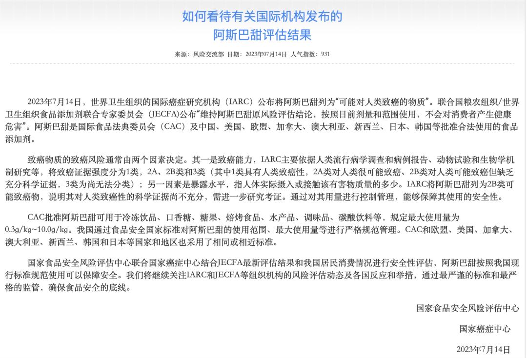 不过,14日晚间,国家食品安全风险评估中心、国家癌症中心联合发文表示,阿斯巴甜按照我国现行标准规范使用可以保障安全。