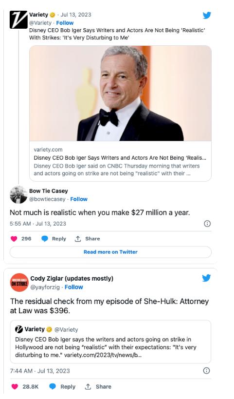 迪士尼CEO艾格尔(Bob Iger)也公开表示,演员和编剧们的期望太高不切实际。他表示好莱坞行业正处在疫情带来的冲击复苏期,这个行业面临着诸多挑战,现在组织大罢工是在最糟糕的时候添乱。