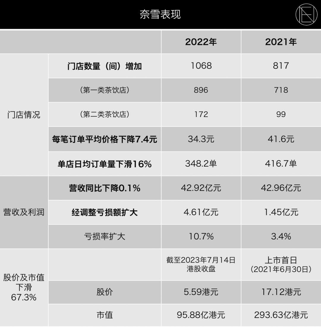 再来看看数据,作为茶饮圈唯一的上市企业,奈雪营收下降、持续亏损的财报,一路下行的股价,也一定程度能反映茶饮赛道的高开低走。