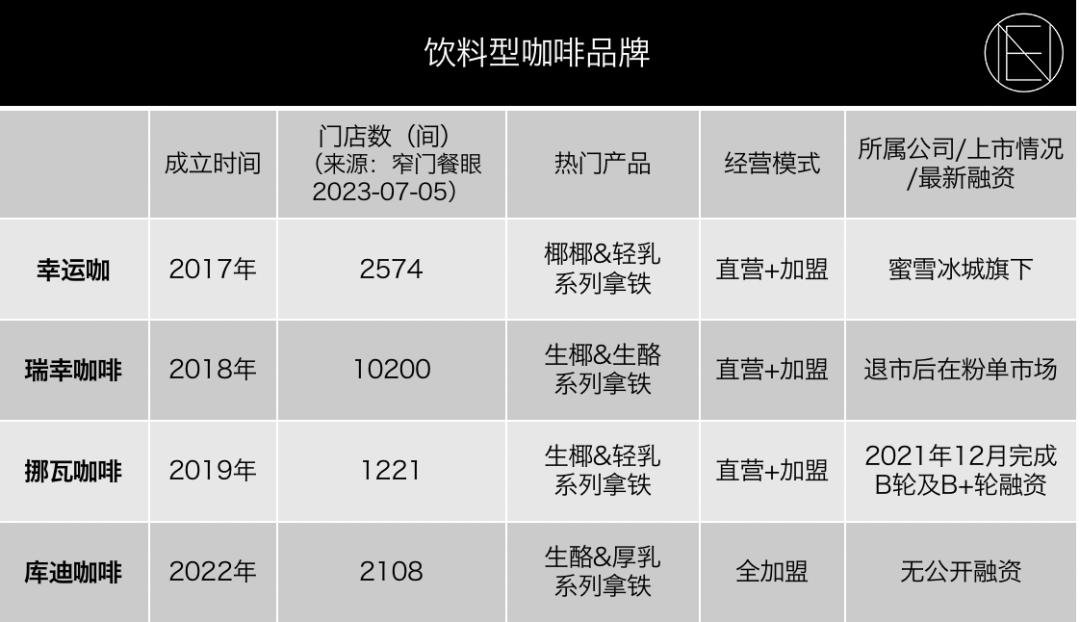 现在跑得最快的品牌都是“饮料咖啡派”。瑞幸门店规模上万,幸运咖、挪瓦咖啡、库迪咖啡的门店数都在千家以上。