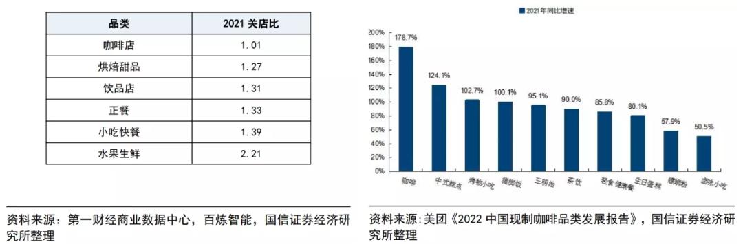 根据国信证券,2021年咖啡在各个餐饮品类中关店率最低。美团《2022 中国现制咖啡品类发展报告》显示,2021年美团外卖的小众品类订单量中,其中咖啡品类订单量同比增长178.7%,远超茶饮。这两组数据反映出,咖啡有更高的线上率、复购率和抗风险性。
