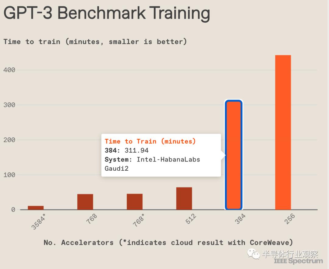 Gaudi 2在GPT-3上的训练时间情况是在384个加速器上花费了311分钟,作为对比,英伟达和云提供商CoreWeave合作运行的3584 GPU计算机在不到 11 分钟内完成了这项任务,如下图所示。以每个芯片为基础,英伟达H100系统的任务速度是Gaudi2的3.6倍。但是Gaudi 2的优势在于其成本要比H100低,而且能跑大模型。