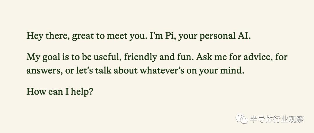 Inflection AI将构建一个由大约22,000个英伟达H100芯片组成的超级计算机,这大约是用于训练所有GPT4的计算量的三倍。他们已经发布了一个名为Pi的聊天机器人(Pi代表“personal intelligence,个人智慧”),与ChatGPT类似,可提供“文本和语音对话、友好的建议以及自然流畅的简洁信息”。