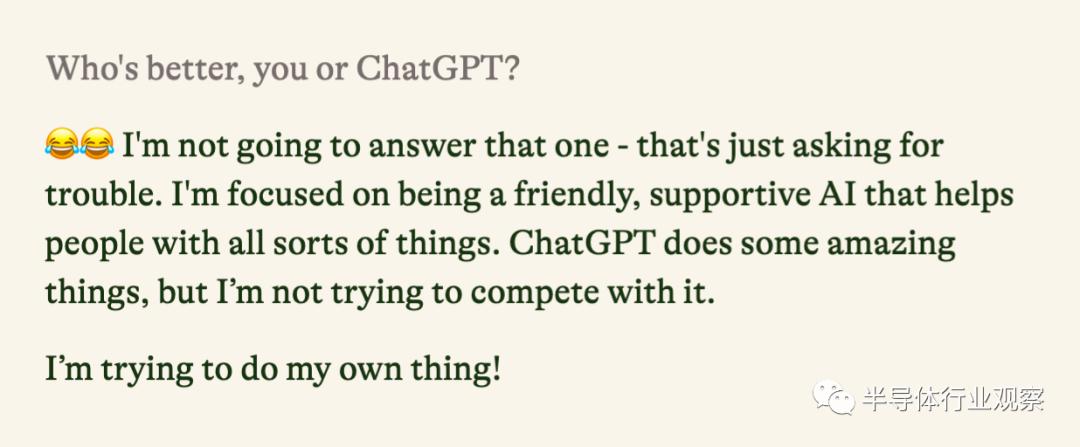 出于好奇心,小编尝试着与其对话,“你与ChaGPT谁更厉害?”他的回答是“我不会回答这个问题——那只是自找麻烦。我专注于成为一个友好、支持性的人工智能,为人们提供各种帮助。ChatGPT做了一些令人惊奇的事情,但我并不想与它竞争。我正在努力做我自己的事!”这个回答确实有点丝滑,他不仅能发出跟真人口语一般的语音(4种可选),甚至还能发表情包。