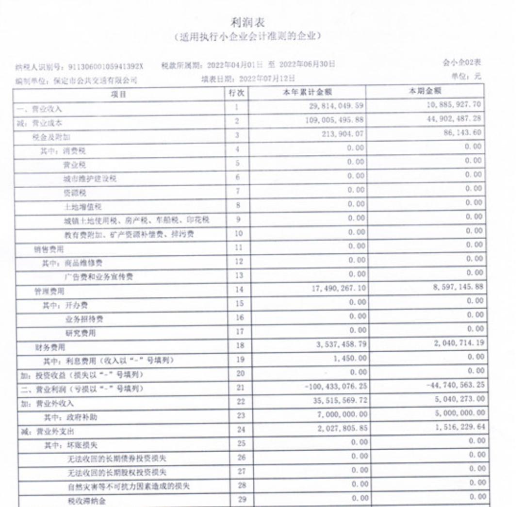 保定公交公司曾在2022年7月15日公布一份财务状况表,填表日期为2022年7月12日的利润表显示,本年累计金额中,保定市政府补助为700万元,营业收入为2981.4万元,营业成本为1.09亿元,利润总额为-6694.53万元。