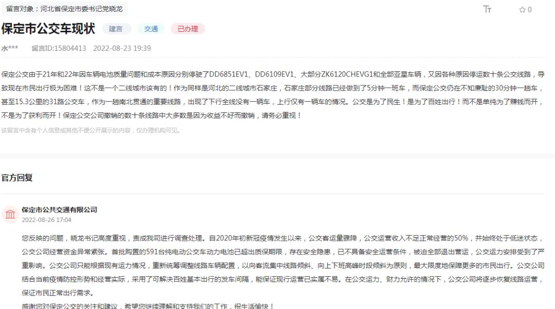 2022年8月,曾有市民在咨询保定市公交现状时,保定公交公司回复称,首批购置的591台纯电动公交车动力电池已超出质保期限,被迫退出营运,公交运力安排受到了严重影响。