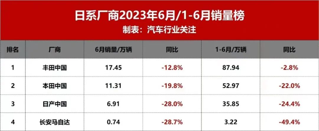 而从油混主力日系的整体情况来看,上半年的销量数据明显不乐观。日系除了丰田保持微跌外,本田和日产的跌幅都超过20%。电动化技术缺失的马自达,更是跌幅近50%。