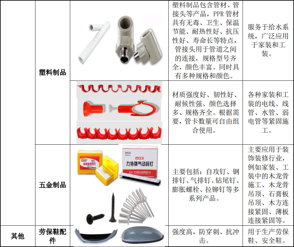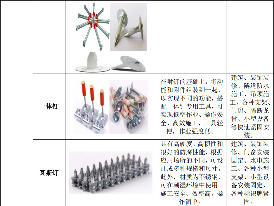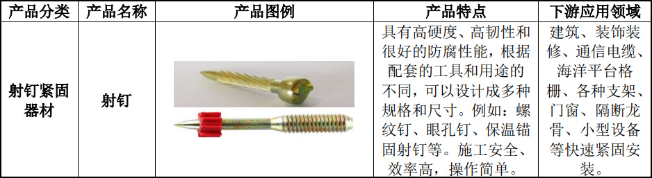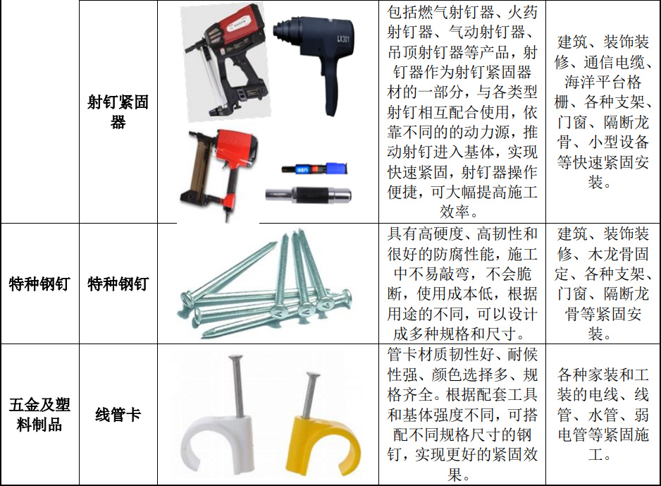 公司专注于提供高效紧固应用方案,主要有射钉、射钉紧固器、特种钢钉、五金及塑料制品等产品,产品已广泛应用于建筑、装饰装修、清洁能源、石油化工、矿山、造船、通信、水下作业及轨道交通等行业。