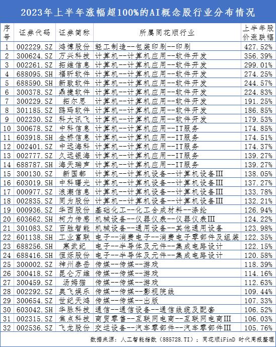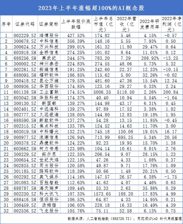 2023年上半年“AI牛股榜”:32只股票涨超100%,中小盘受追捧,传媒股频跨界