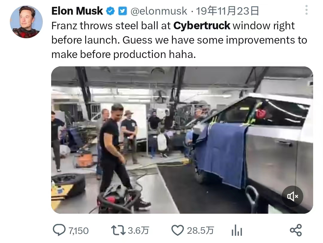 发布会上的小意外竟成为了人们茶余饭后讨论特斯拉的谈资,顺势给Cybertruck增加了不少热度和梗。几块被击碎的玻璃犹如特斯拉的“广告费”,Cybertruck的订单仍然如潮水般涌入。马斯克还曾在发布会上称会想办法修复玻璃易碎的“Bug”,不知道量产版怎么样。