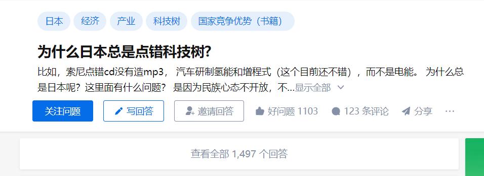 知乎平台有一个热议问题“日本为什么总是点错科技树”,例举了日本在DVD、电视、音乐播放器、移动存储等领域出现的问题。一些网友认为,日本面积小、资源少,所以许多商业行为看上去似乎在赌。