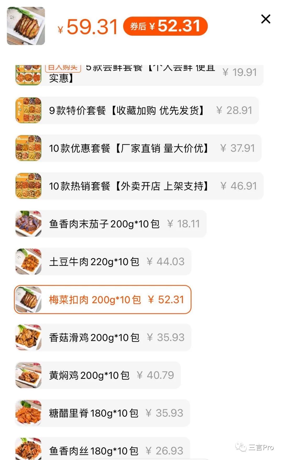 很多预制菜商家都有炒菜类料理包,大部分都在30-50元10包,合3-5元一份菜。
