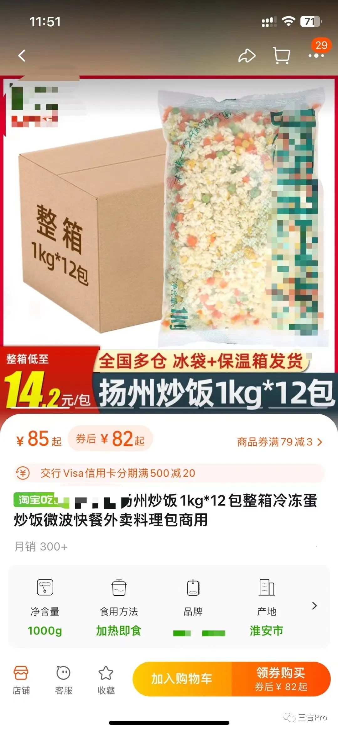 甚至连蛋炒饭都有预制的,可能你吃的外卖扬州炒饭就只是预制品加热了而已。1千克蛋炒饭预制品价格14元,简单加热就能翻倍卖。