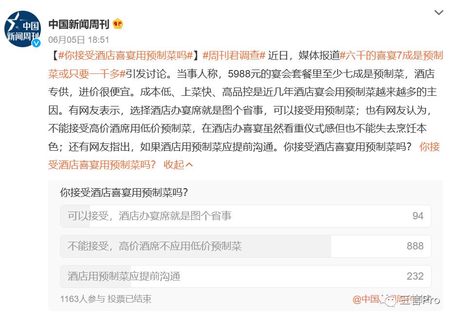 上个月,一则“六千的喜宴7成是预制菜或只要一千多”的消息曾引发讨论。在有关此事的一个调查中,绝大多数网友都表示不能接受高价酒席使用低价预制菜,还有一部分网友认为酒店应该提前沟通。