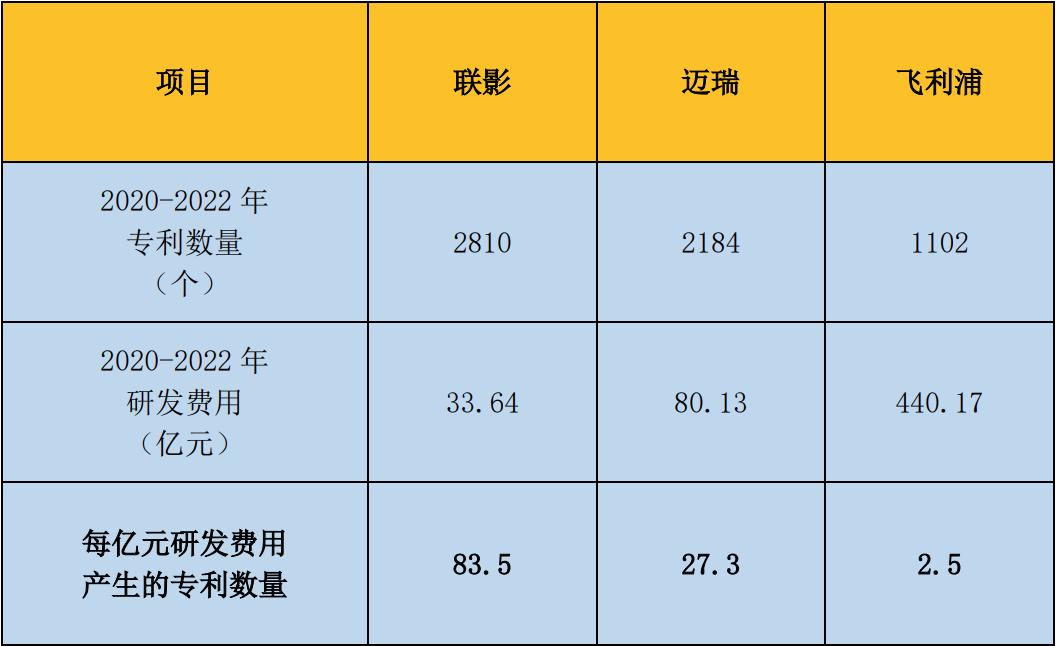 当然,迈瑞的研发费用率低,不一定等于研发效率低。我们可以更进一步的用“经调整专利/研发费用”,来看看三家公司的研发效率。最终得出的效率值——“每亿元研发费用产生的专利数量”——联影是迈瑞的3.1倍,是飞利浦的33.4倍。