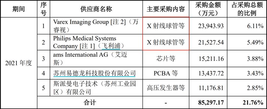 图:联影医疗2021年的前五大供应商,来源:联影招股书