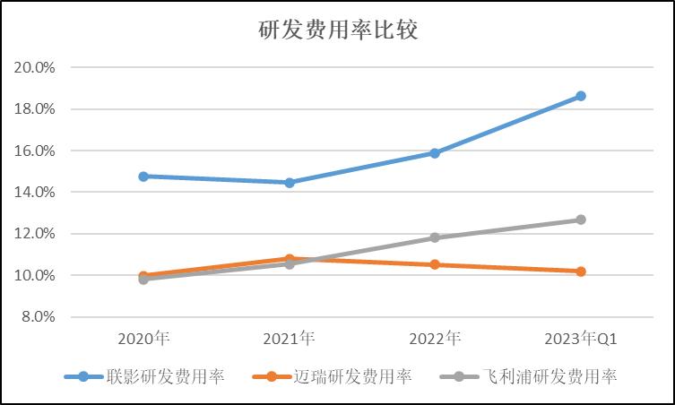 1Q23飞利浦研发费用率为12.7%,迈瑞为10.2%,联影为18.6%。近几年的研发费用趋势,如下图。