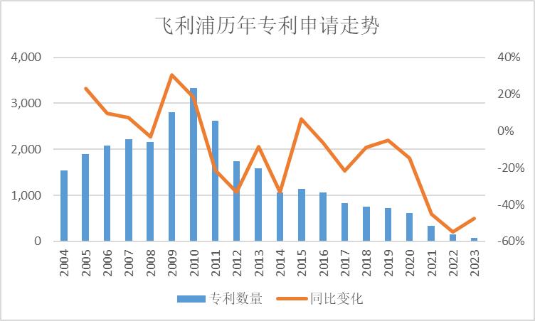 有人可能奇怪,飞利浦,花了440亿元,只申请了1102件专利,是不是有点扯?是不是中国专利质量没有国外的高?还真不是。我们来看飞利浦历年的专利申请趋势,你就明白了,纯粹是公司自身出了问题。