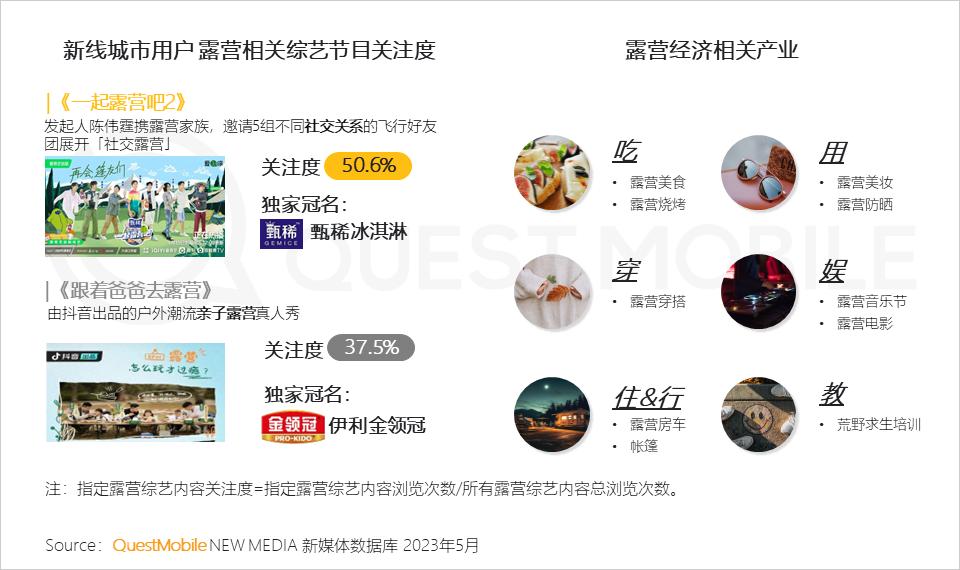 QuestMobile数据显示,在关注露营综艺的新线城市用户中,由甄稀独家冠名的《一起露营吧2》节目关注度达50.6%,伊利金领冠独家冠名的《跟着爸爸去露营》节目关注度达37.5%。