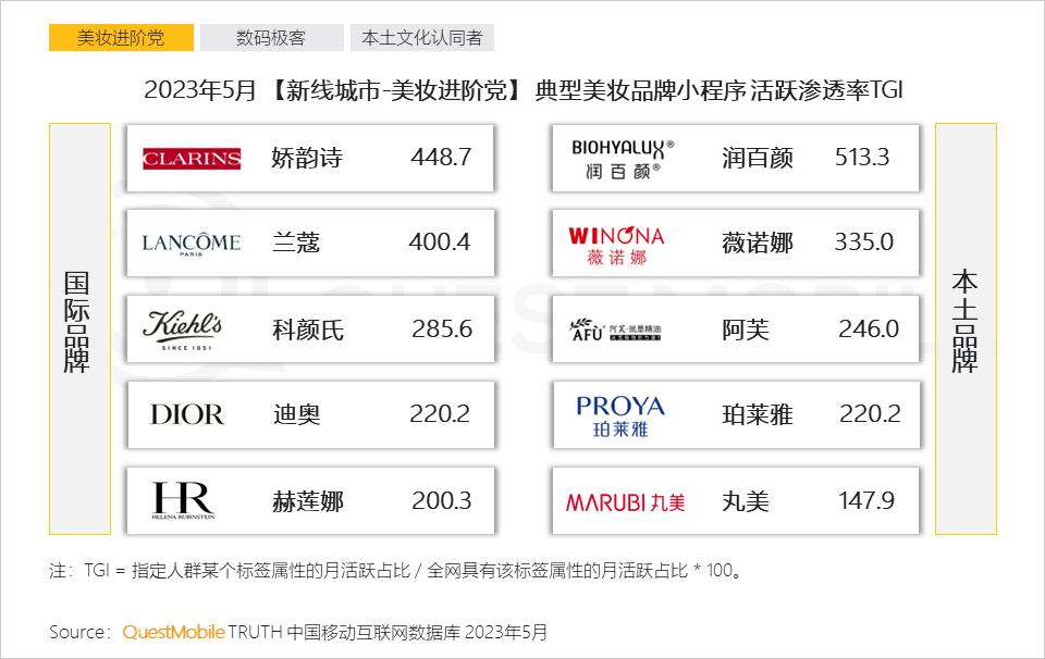 QuestMobile数据显示,润百颜在玻尿酸上的专研实力受到了【新线-美妆进阶党】的拥护和信赖;此外,娇韵诗、兰蔻、薇诺娜等品牌均凭借着自身的研发能力在此批用户中“出圈”。