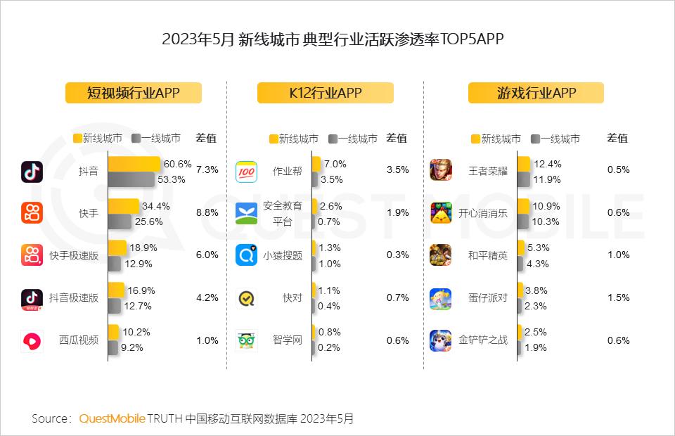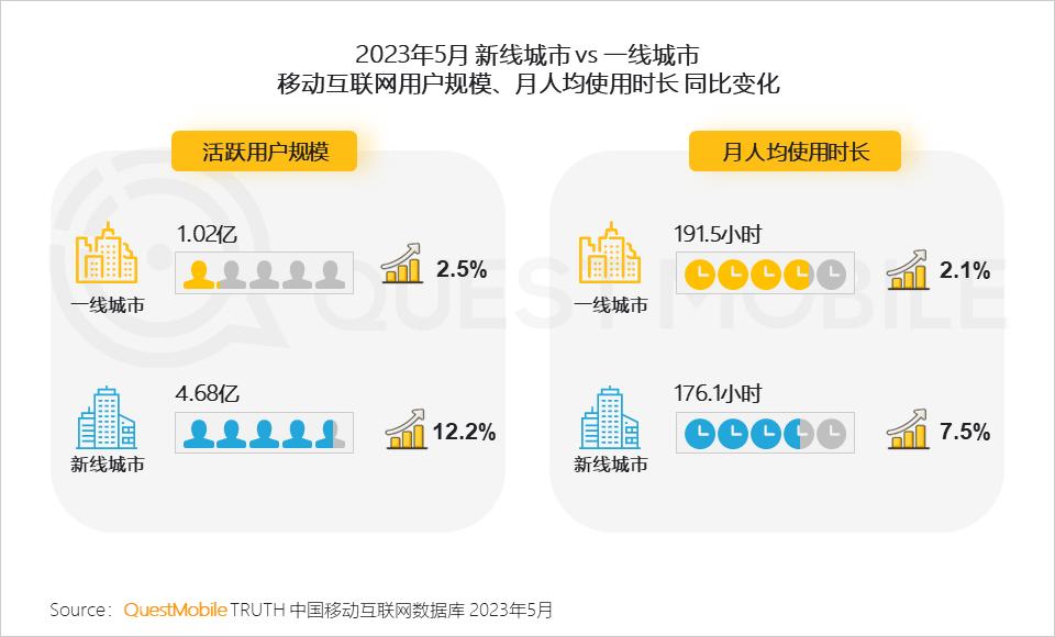 QuestMobile数据显示,2023年5月,新线城市移动互联网活跃用户规模达4.68亿,同比增长12.2%,月人均使用时长176.1小时,同比增长7.5%,增速是一线城市的3.6倍。
