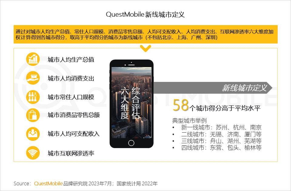 1、从城市发展、人均可支配收入、互联网渗透率等六大维度,定位经济发展趋势良好向上的“新消费前线城市”,简称“新线城市”