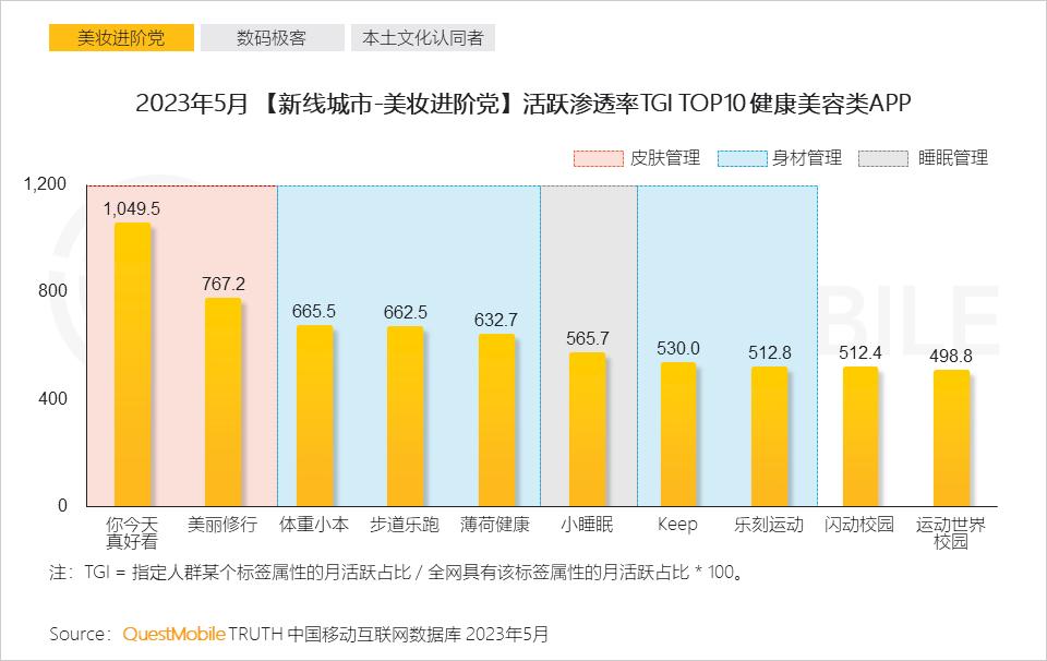 QuestMobile数据显示,闪动校园、运动世界校园此类适用于学生群体的APP也在【美妆进阶党】中被高频使用。