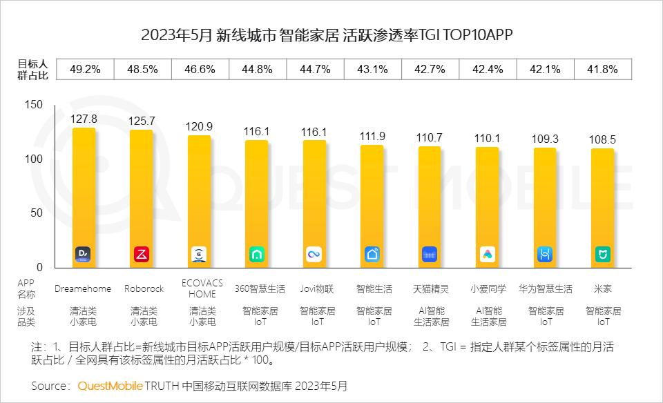 QuestMobile数据显示,追觅、石头、科沃斯此类智能小家电APP的用户中,近半数为新线城市用户。