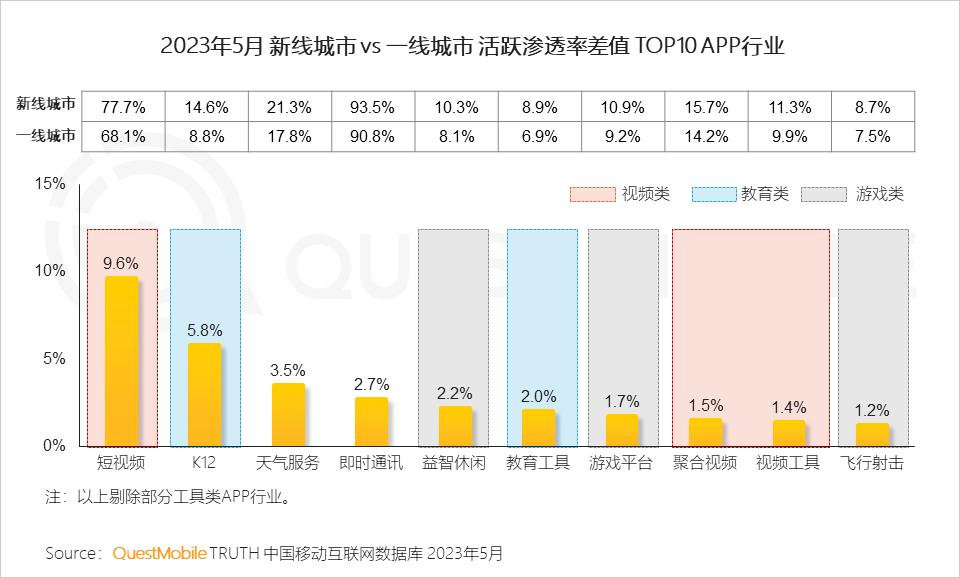 QuestMobile数据显示,今年5月,短视频类APP在新线城市中的活跃渗透率达77.7%,超过一线城市将近10个百分点。此外,新线城市家长们也越来越习惯“拥抱”线上工具参与孩子教育。