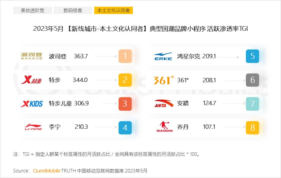新线城市的用户画像与一线城市差别较大,80、90、00后占比超5成,已婚群体占比近7成,由此形成了较大的“显性圈层”,如美妆群体、爱宠群体、数码极客群体、本土文化认同群体等,他们对消费、品牌的追求,显示出了显著差异,如国潮品牌波司登、特步、特步儿童、李宁渗透率位居前四位,良渚古城、上海科技馆自然博物馆天文馆、园博园、大唐芙蓉园、黄山旅游、陕西博物馆的热度位居前六位。