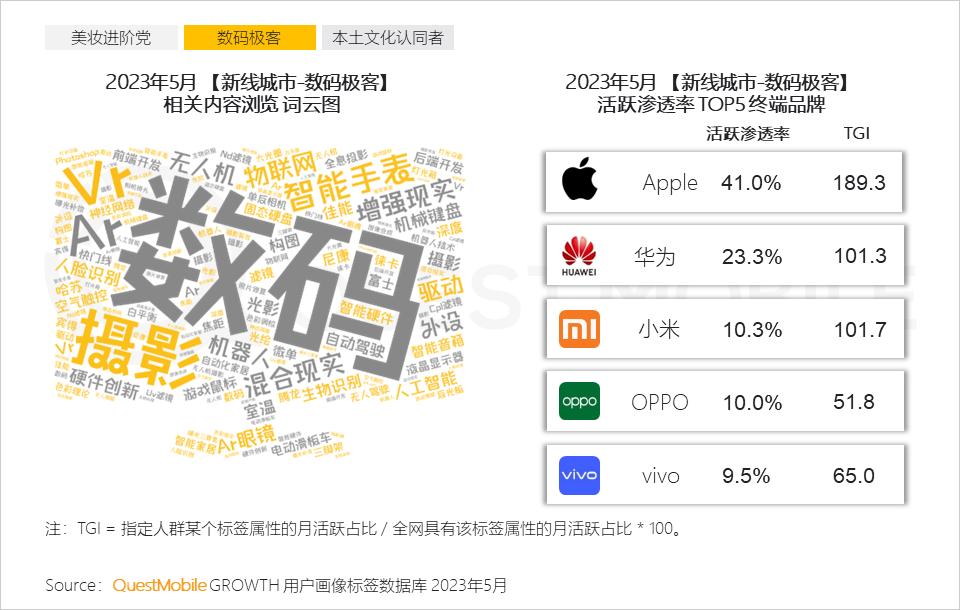 5、追求极致性能的【数码极客】一族,在终端设备选择上,对苹果表现出明显的偏好,其次是具有硬核摄像功能的华为