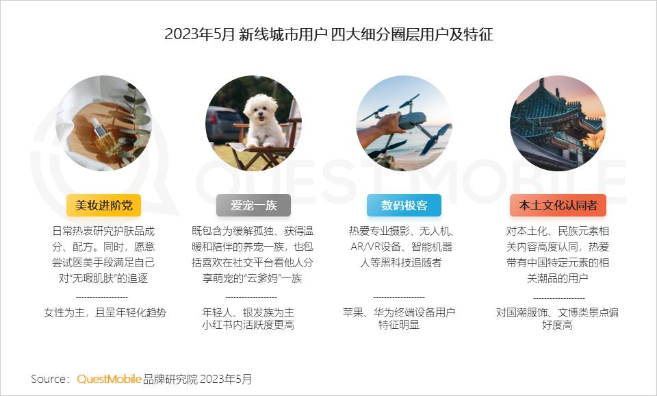 2、伴随着新线用户生活态度、消费观念的逐步进阶,四类细分圈层也逐渐“显性化”,这也为品牌透过圈层,与目标群体产生连接提供了可能