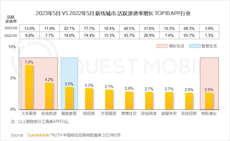 同时,在娱乐、生活、鸡娃等方面,新线城市用户表现的更加均衡,消费上面追求精致和性价比两不误,受此影响,短视频类APP活跃渗透率达到77.7%(高出一线城市近10个百分点),K12渗透率达到14.6%(高出一线城市近6个百分点);体验型消费受到追捧,旅游、演出、智能家居类APP活跃渗透率持续增加且快速超过一线城市,火车服务、在线旅游、智能家居、电影演出渗透率分别为13.8%、11.9%、22.1%、3.9%(一线城市分别为6.8%、7.7%、18.6%、1.3%)。