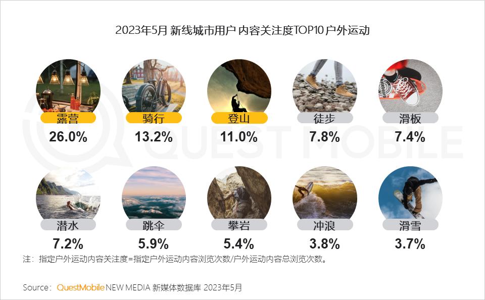此外,多种户外运动的快速崛起,也为新线城市注入了活力,露营、骑行、登山的内容关注度,分别达到26%、13.2%、11%……